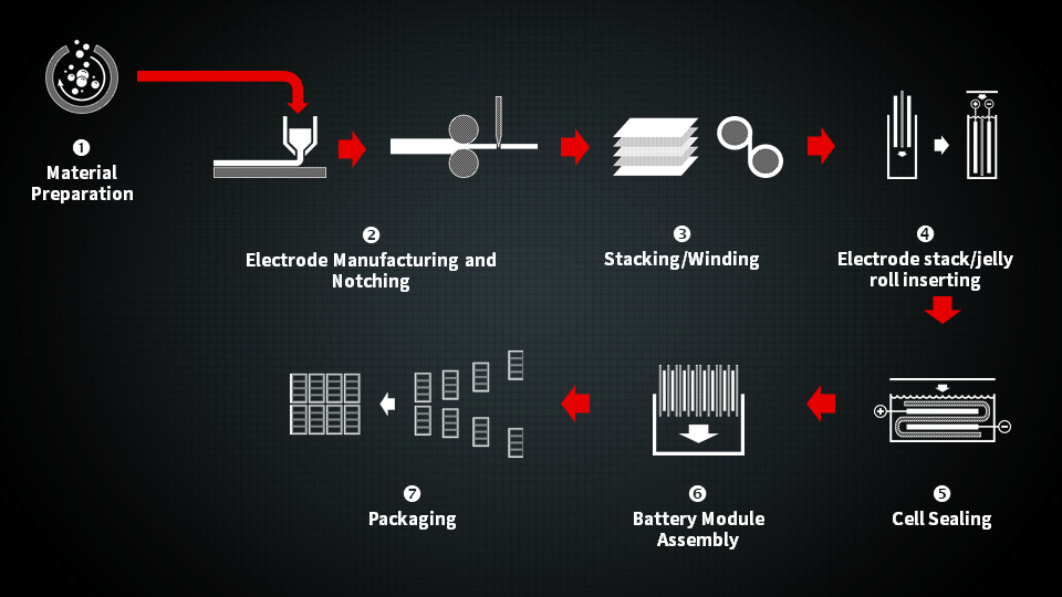 通常,鋰電池的生產包括材料準備、電極制造和開槽、電芯制造、電池模塊組裝和電池封裝幾個步驟。通常,鋰電池的生產包括材料準備、電極制造和開槽、電芯制造、電池模塊組裝和電池封裝幾個步驟。