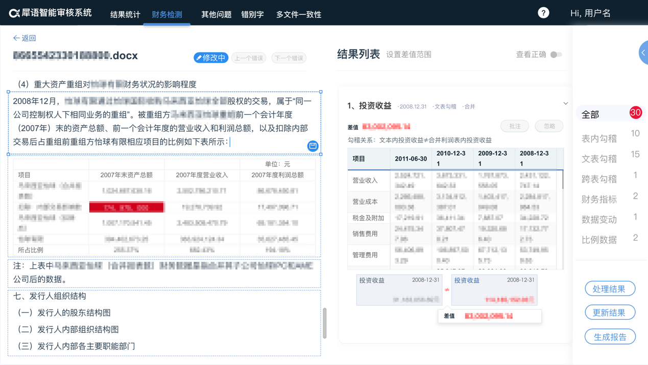 無論是企業發布的財務相關文檔,如審計報告、定期報告,銀行信貸業務的盡調和信貸審批報告,證券發行時的招股說明書、債券募集說明書等,對文檔質量和準確度的把控都非常嚴格。其中,財務審計報告大概在200頁左右,招股說明書等會長達500多頁,需要人工對文檔格式、數字、文字等進行多輪審核,工作量十分龐大。如何讓機器自動檢測各類金融公司中文檔所存在的問題,從而減少人力成本投入,成為犀語面臨的難題。