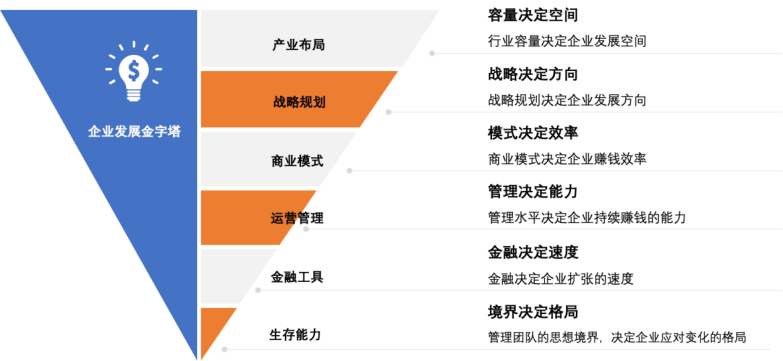 企業管理全景圖是從整體上觀察企業管理,而非僅從局部管理水平來判斷企業的發展,這種整體視角被稱為“企業管理全景圖”。可以用六句話來表述企業管理全景圖:一是容量決定空間;二是戰略決定方向;三是模式決定效率;四是管理決定能力;五是金融決定速度;六是境界決定格局。