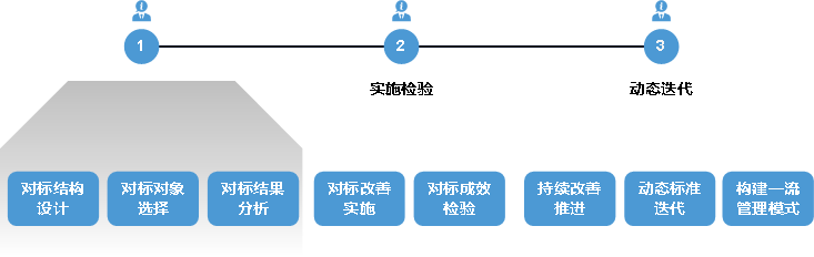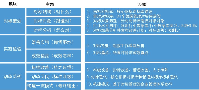 在系統性精益改善實施過程中,關鍵工作推導、方針方策分解中都要運用對標方法,從績效結果和管理方法兩方面查找與標桿、一流之間的差距,防止陳腐。對標步驟如下: