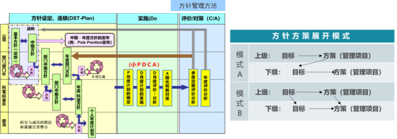 應用戰略管理、方針管理方法,從公司戰略和宏觀經濟指標開始逐層級分解方針方策,確立精益改善項目,實現戰略落地和系統性精益改善,讓精益改善工作直接支撐公司戰略和經營,同時建立起精益改善指標體系和改善課題庫,對各部門和各子公司精益改善工作進行規范化、日常化管控。方針管理方法如下所示: