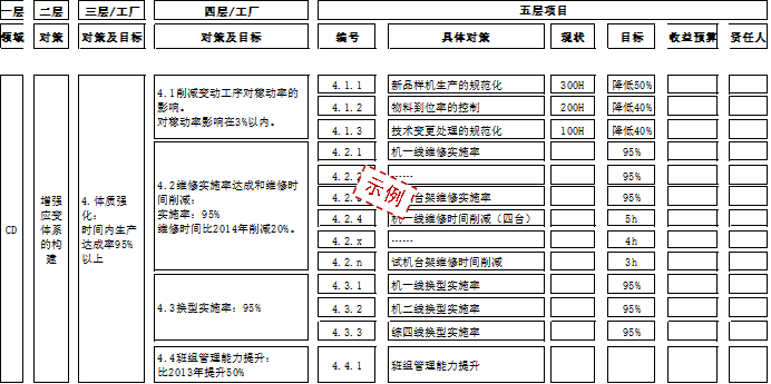 各部門/子公司根據集團精益方針系統圖分解方針方策、制作精益管理表、確立精益改善項目。部門/子公司精益管理表示例如下: