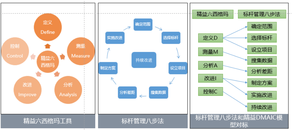 標桿管理八步法是實施標桿管理結構化的工具和方法,與精益六西格瑪相比,標桿管理八步法更強調對標與戰略的銜接性,在明確對標范圍、推動對標執行、主力提升改進方面有顯著作用。